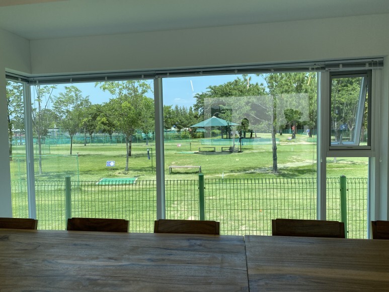실내에서 보는 파크골프장의 풍경이 멋지네요.